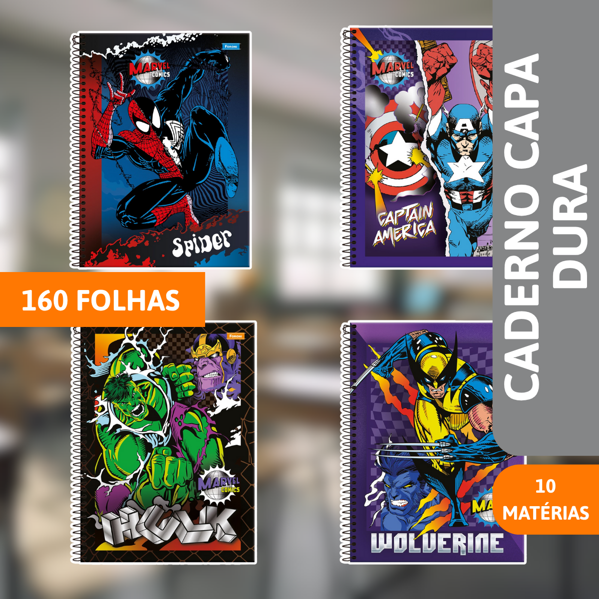 - Tema Marvel Comic: Capas personalizadas com ilustrações vibrantes e icônicas dos super-heróis e vilões da Marvel, tornando o material escolar muito mais interessante e divertido.